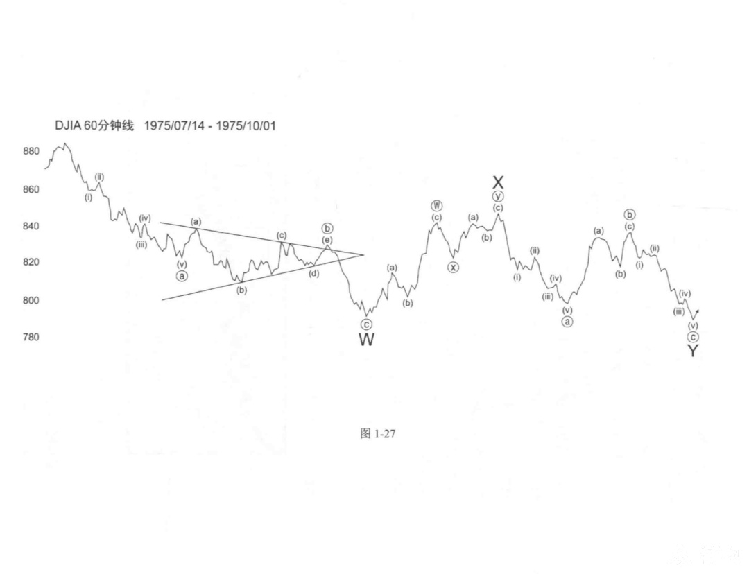 艾略特在不同的时候,用不同的方法来标记各种三浪的联合, 尽管他用来说明的模式总是呈两个或三个并列的平台形调整浪的 样子,如图 1-45 和图 1-46 所示。但是,联合形调整浪的各个分量模式经常在形态上交替。例如,平台形调整浪后跟着三角形调整浪是更典型的双重三浪类型(现在我们知道,截至 1983 年的道 琼斯工业股平均指数就属于这种类型, 见附录 A), 如图 1-47 所示。